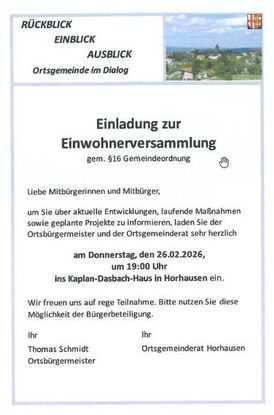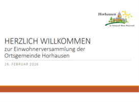 Die Ortsgemeinde Horhausen lädt herzlich ein zur Einwohnerversammlung am Donnerstag, den 26. Februar 2026 ab 19 Uhr im KDH.
